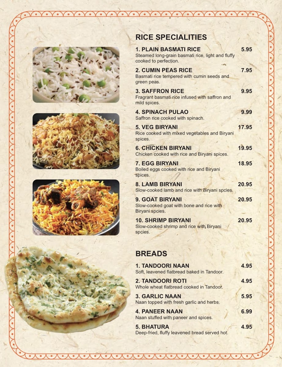 Basmati rice cooked at a very low heat with spice-marinated lamb and very rich Indian spices.