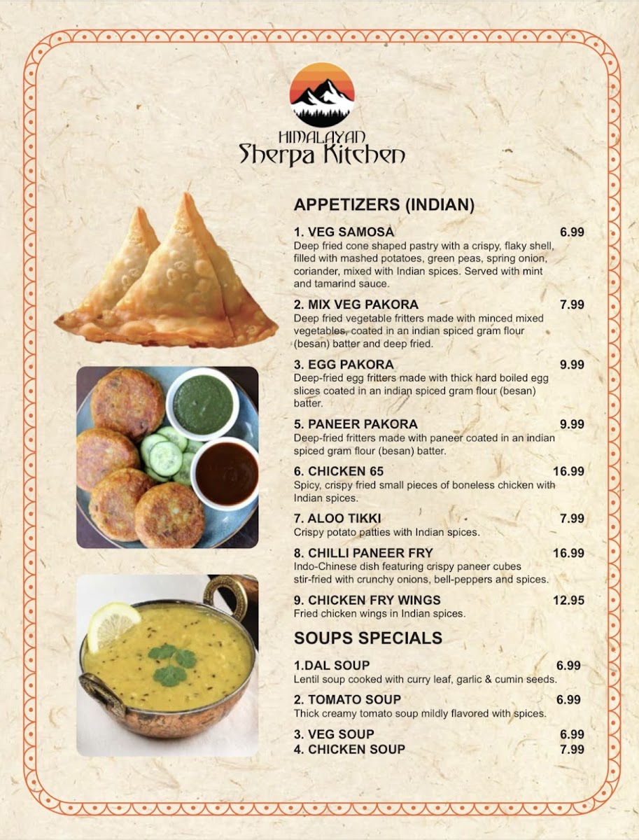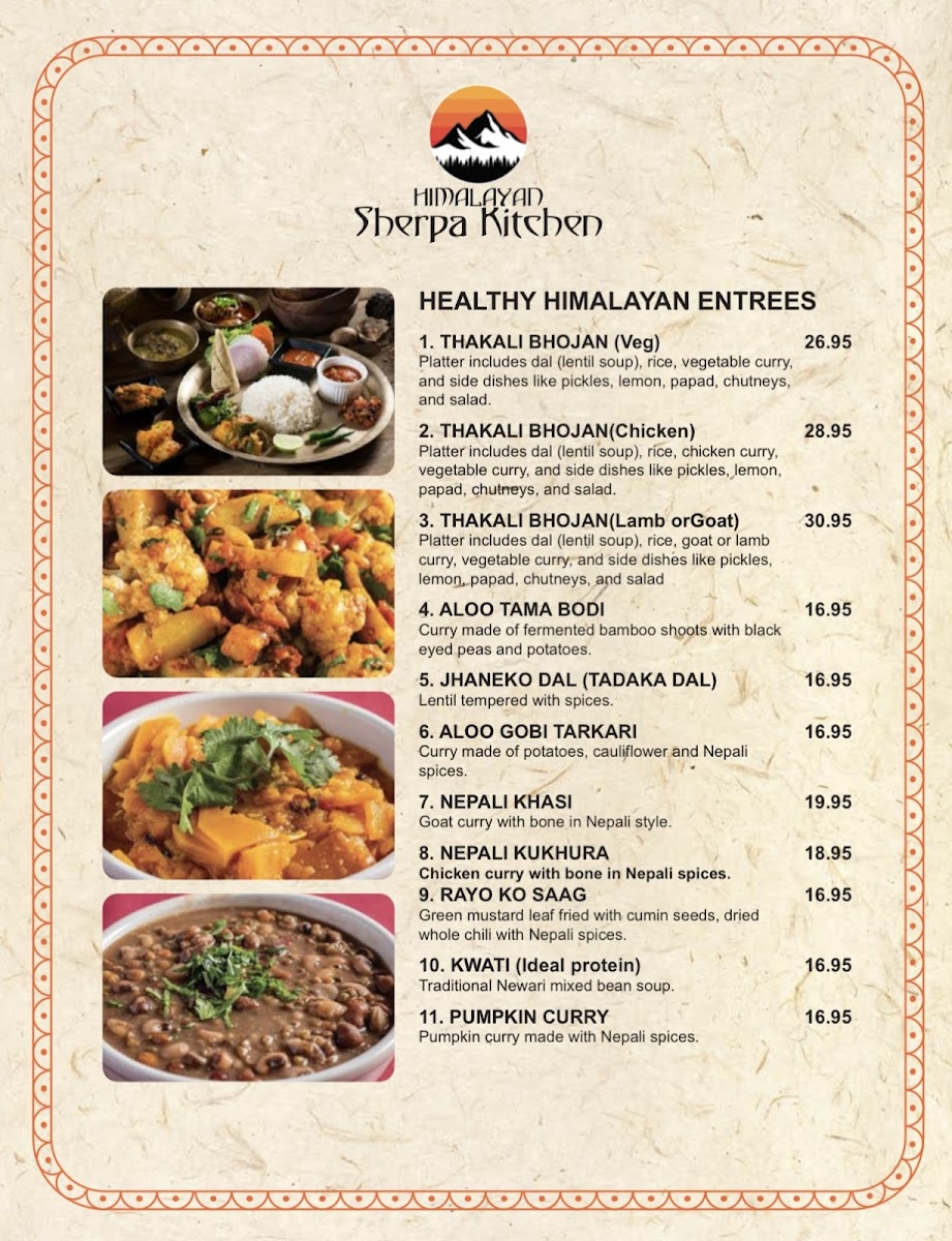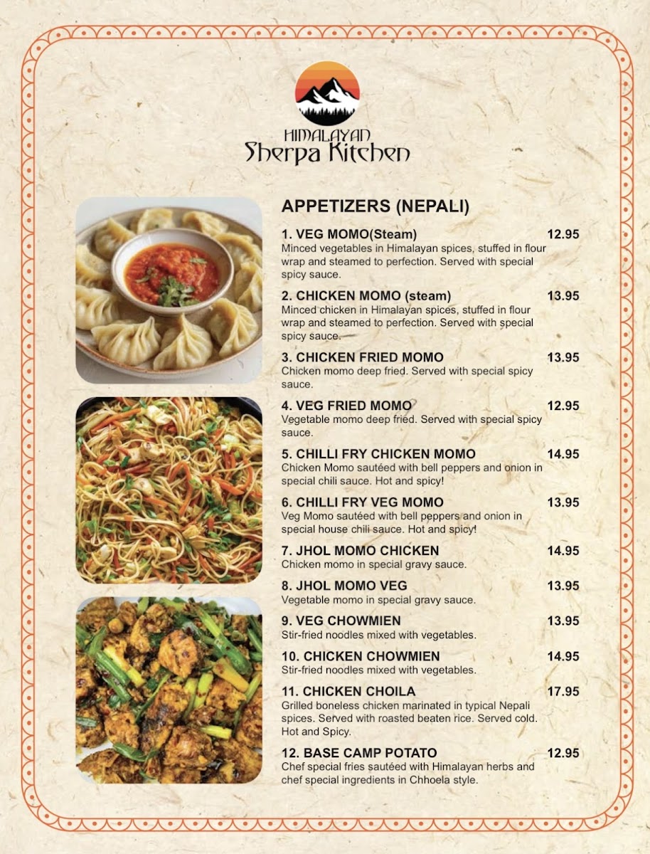 Step into the cozy and inviting world of Himalayan Sherpa Kitchen, where the rich flavors of Nepal and the Himalayan region come to life. The bold spices and aromatic herbs blend perfectly in every dish, offering a unique and unforgettable culinary experience. At the heart of the menu are authentic recipes passed down through generations, each dish designed to take your taste buds on a flavorful journey. From the warming stews to the perfectly spiced momos, there’s something for every craving. The Himalayan Sherpa Kitchen Menu features a variety of comforting meals, including vegetarian options, that highlight the best of traditional Himalayan cooking. Whether you’re enjoying a hearty bowl of dal bhat or indulging in a sweet dessert, each bite is made with love and passion. This is a place where every meal feels like a home-cooked family gathering, and it’s sure to become your go-to spot for flavorful and satisfying meals.